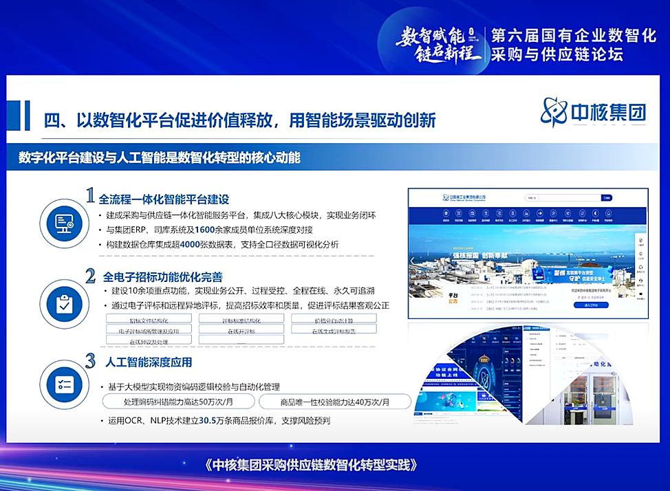 中國核工業集團有限公司經營管理部副主任劉萍進行了《系統性變革推動采購供應鏈升級,助力核工業高質量發展》主題分享。劉萍指出,核工業是國家安全的戰略基石,中核集團以“自主可控、數智賦能”為目標,構建了一體化智能管理體系,通過數字化技術提升采購決策的科學性和精準性,優化供應鏈資源配置,實現了采購供應鏈的高效運作和風險管控,為核工業的高質量發展筑牢基礎。